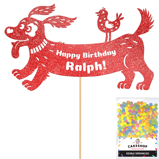 Calling all dog lover's - we have a paw-some topper for you! This cute sausage dog birthday topper is perfect for any puppy pet owner! Customise with any name and our designers will do the rest to make your topper look amazing. Want a specific colour? No problem, simply pick from our 14 gorgeous double sided glitter shades. Cakeshop glitter toppers come with a 25g pack of edible sprinkles to elevate your bake even further, see 'What's Included' section below for full details and ingredients.