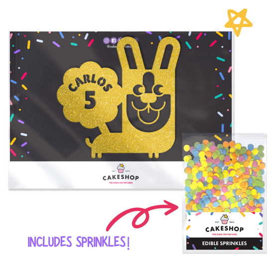 This adorable small cute dog custom glitter topper is the best companion for a dog lover's birthday cake! Customise your topper with any age and name and pick your chosen colour from our 14 glitter shades! Cakeshop glitter toppers come with a 25g pack of edible sprinkles to elevate your bake even further, see 'What's Included' section below for full details and ingredients.