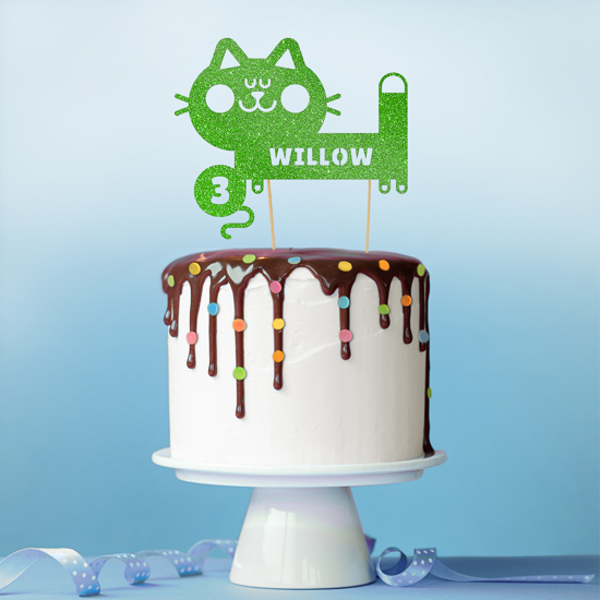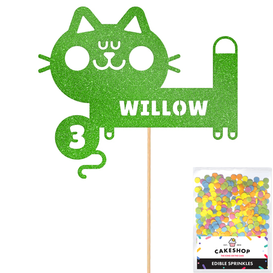 Add some extra cuteness to their birthday cake with our adorable cartoon birthday cat glitter topper! Customise this topper with any name and age using our easy editor and choose a colour from our selection of 14 glitter shades. Cakeshop glitter toppers come with a 25g pack of edible sprinkles to elevate your bake even further, see 'What's Included' section below for full details and ingredients.